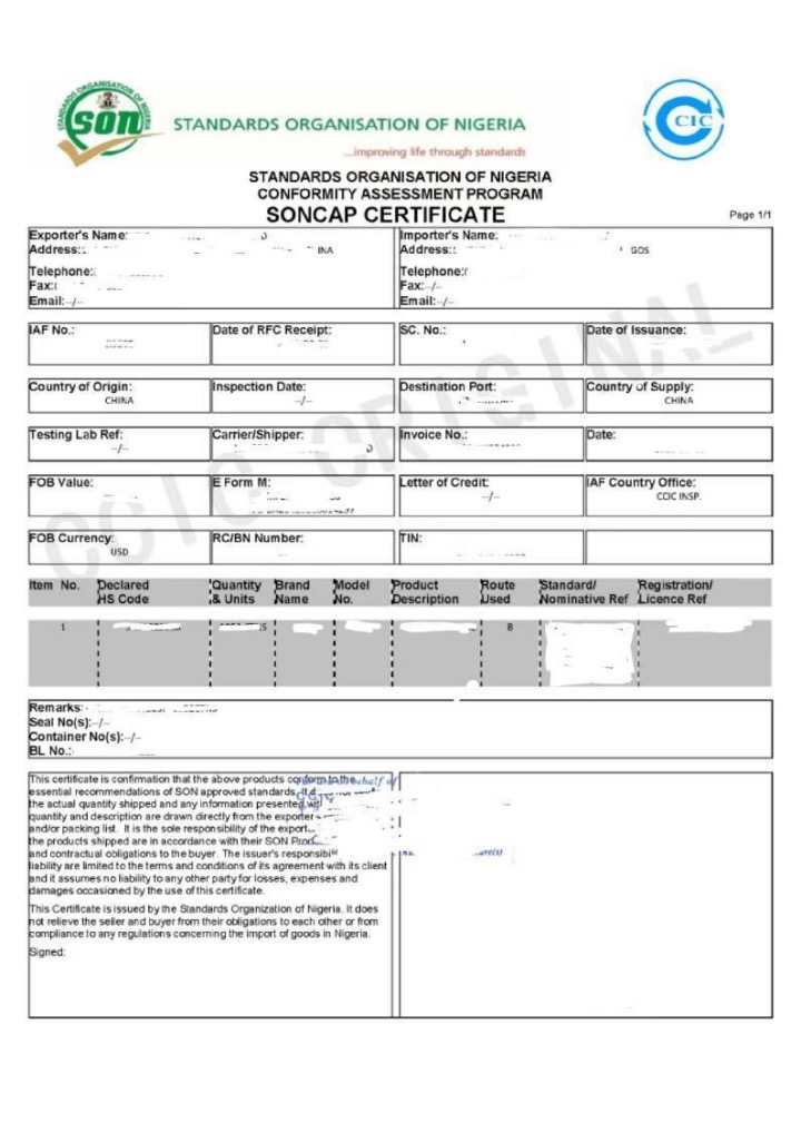 SONCAP全稱為“Standard Organization of Nigeria Conformity Assessment Programme”,是尼日利亞標(biāo)準(zhǔn)組織(SON)針對進(jìn)口管制產(chǎn)品實(shí)施的強(qiáng)制性合格評定程序,用于證明產(chǎn)品符合該國安全標(biāo)準(zhǔn),并作為海關(guān)通關(guān)的必要文件。